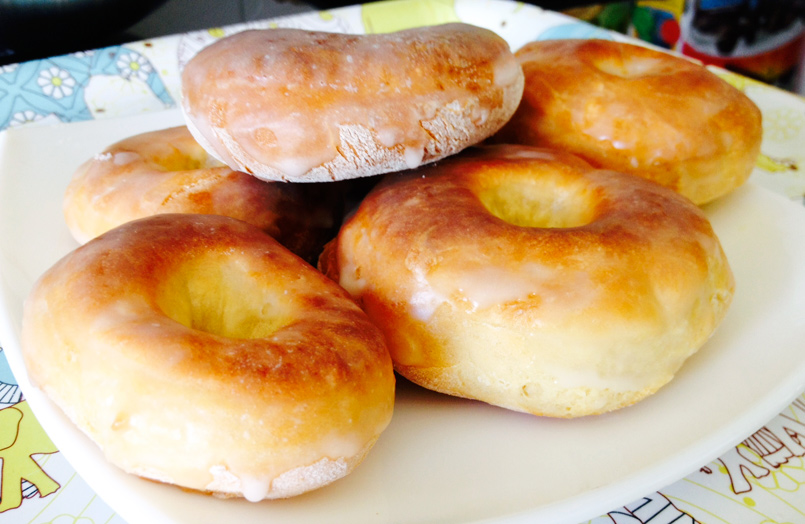En un bol ponemos 6 cucharadas de agua y 2-3 de esencia de vainilla. Le añadimos 150 gr de azúcar glas. Mezclamos bien, y con la ayuda de una brocha de silicona, vamos pintando cada uno de los donuts una vez que están fríos.