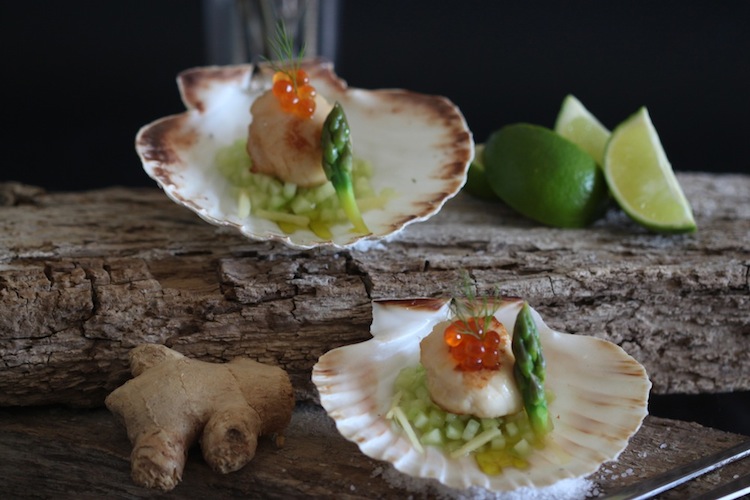 Vieiras a la plancha con pepino, huevas de salmón y aceite de jengibre