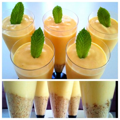 Cubre con la mousse de mango cuatro copas .Alterna una capa de nata montada y una de rosegones y termina con otra capa de mousse.Decora con la nata restante rodajitas de mangoy rosegones .Deja cuajar en la nevera.