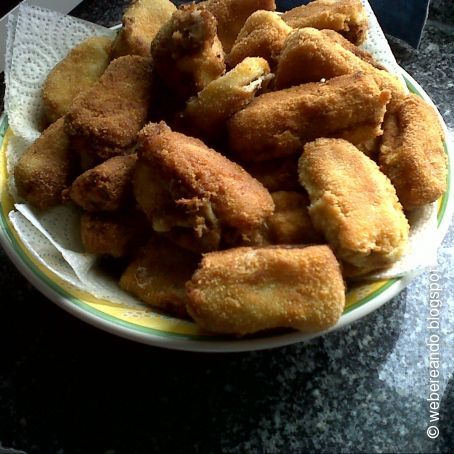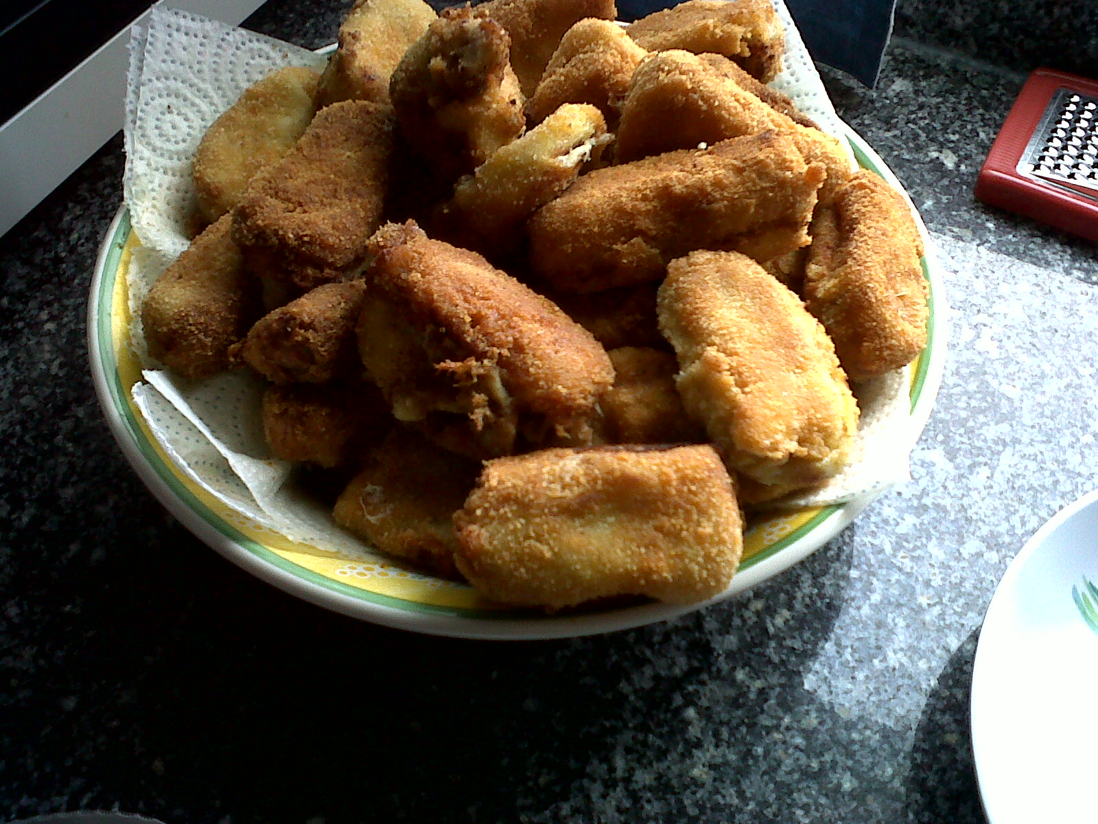 Hacer las croquetas y pasarlas por harina, huevo batido y pan rallado.