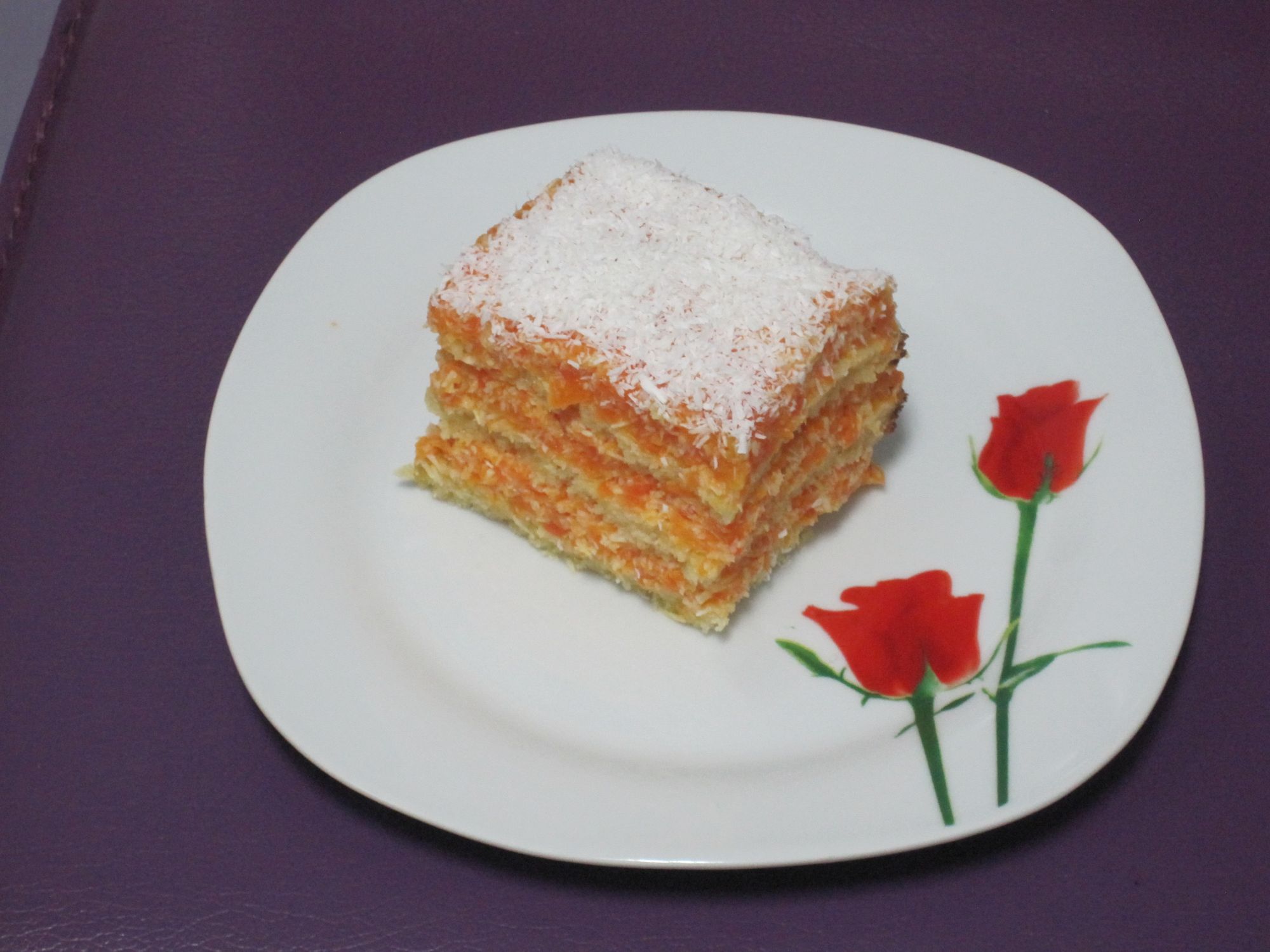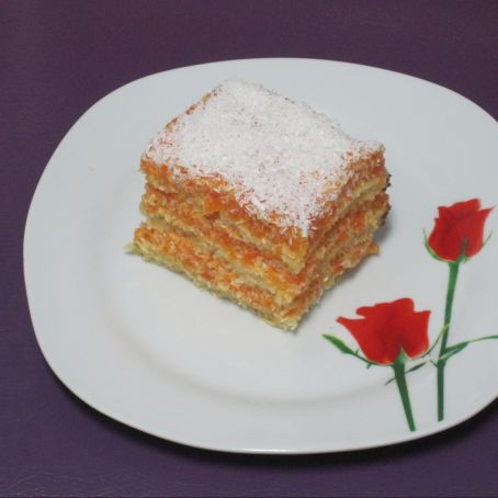 En un molde desmontable colocar una base de bizcochos emborrachados con ron e ir alternando con el puré hasta tener 4 capas. Terminar espolvoreando coco rallado por encima.