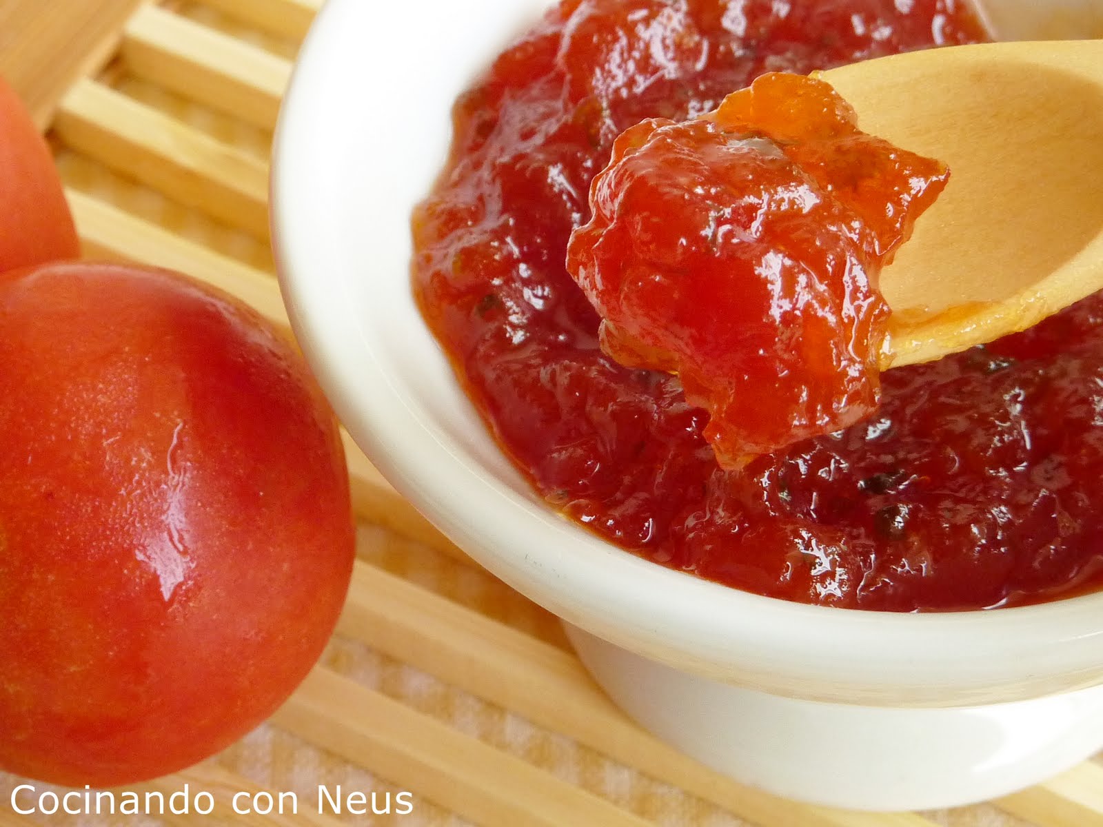 Escaldar los tomates en agua caliente pelar y picarlos en rodajas poner en un recipiente una base de tomates y otra de azucar hasta que se terminen los tomates .