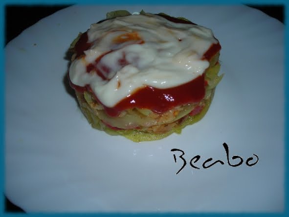 Una vez esté todo listo, pondremos en un plato. Colocaremos un haro de repostería, de 10 cm de diámetro, en el centro del plato e iremos poniendo capas, primero de patata, después de la mezcla de bacalao, nuevamente patata, bacalao y acabaremos con patata. Sobre esta, echaremos un poco de tomate frito y bechamel y retiraremos el haro.