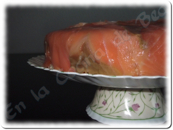En el plato donde vayamos a presentar el pastel, ponemos la primera lámina de bizcocho y la cubrimos bien con el preparado de lechuga, tomate y atún. Cubrimos con otra capa de bizcocho en la que pondremos el preparado de lechuga y surimi. Por último, colocamos la tercera capa de bizcocho y vamos a untarlo todo de mayonesa, por encima y los laterales y, después, iremos forrando todo el bizcocho con las lonchas de salmón ahumado.