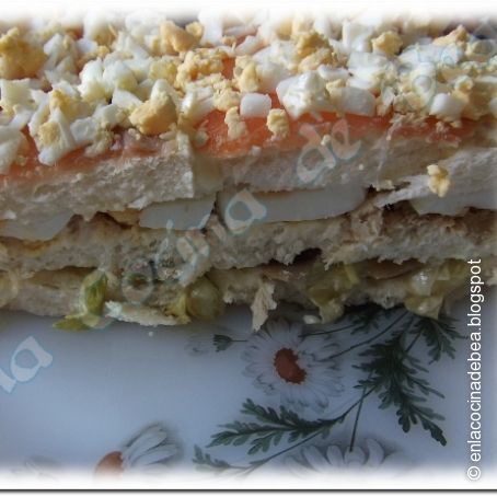 Ponemos otra capa de lonchas de pan de molde y volvemos a untar con mayonesa. Echamos el atún bien desmenuzado y 4 huevos duros en rodajas, cubriendo el atún.