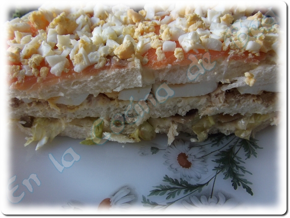 Disponemos una última capa de lonchas de pan de molde que volvemos a untar de mayonesa, colocamos las lonchas de salmón ahumado y los 2 huevos duros restantes picaditos.