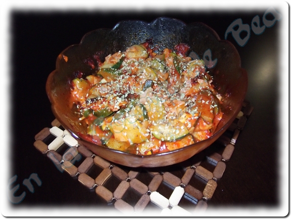 Lavamos el calabacín, lo secamos bien y lo cortamos en trocitos como si fuesen para hacer una tortilla. Los ponemos en un recipiente apto para microondas y le añadimos atún desmenuzado o, como en mi caso, jamón york bien picadito. Agregamos un buen chorro de tomate frito light, mezclamos bien y metemos en el microondas, tapado con una cúpula o film apto para micro, durante unos 20 - 25 minutos (yo lo tuve 20 minutos a máxima potencia).
