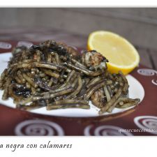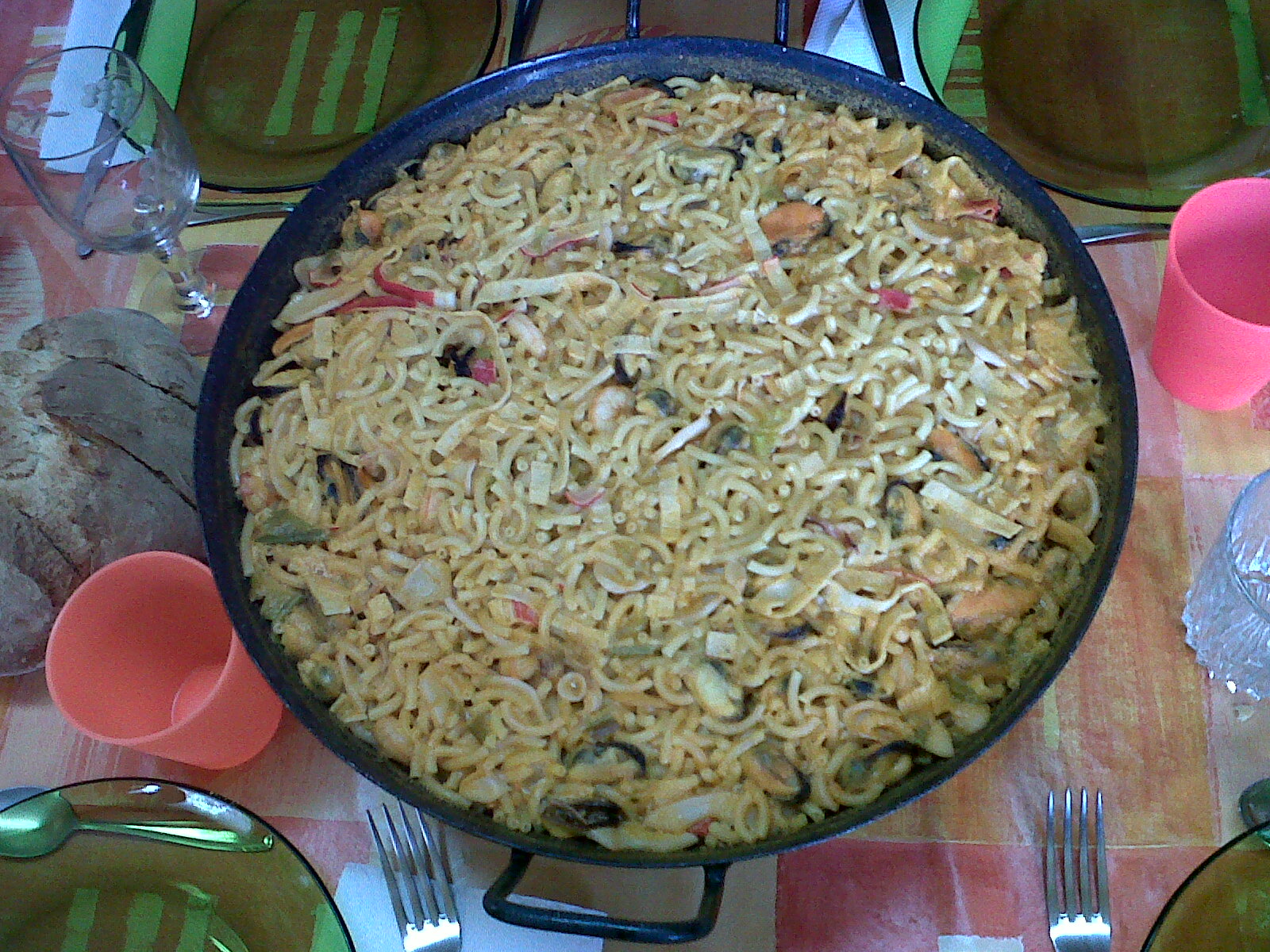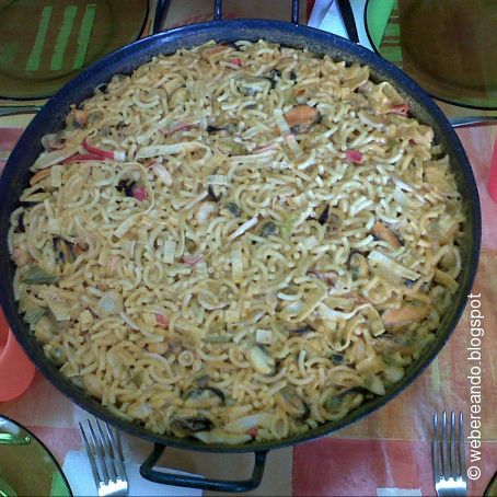 Ahora pon la fideuá o fideos del nº 2 ,rehogarlos un pocoy añadir el caldo de cocer los mejillones, los calamares y si es poco añadir caldo de pescado hasta cubrirlo todo. Probar entonces de sal y rectificar si es necesario.