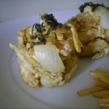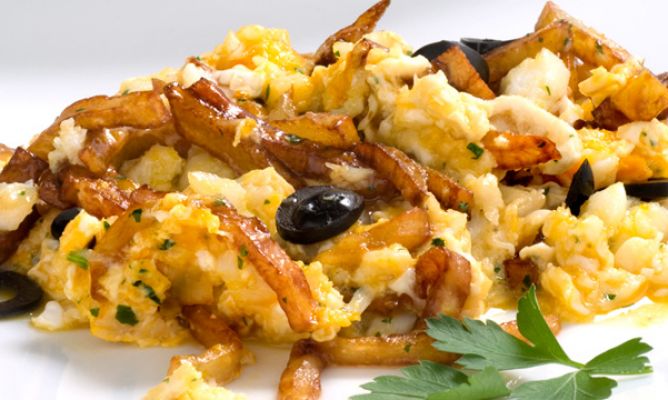 Removemos hasta que cuaje el huevo, ponemos en una fuente y decorar con perejil picado y aceitunas.