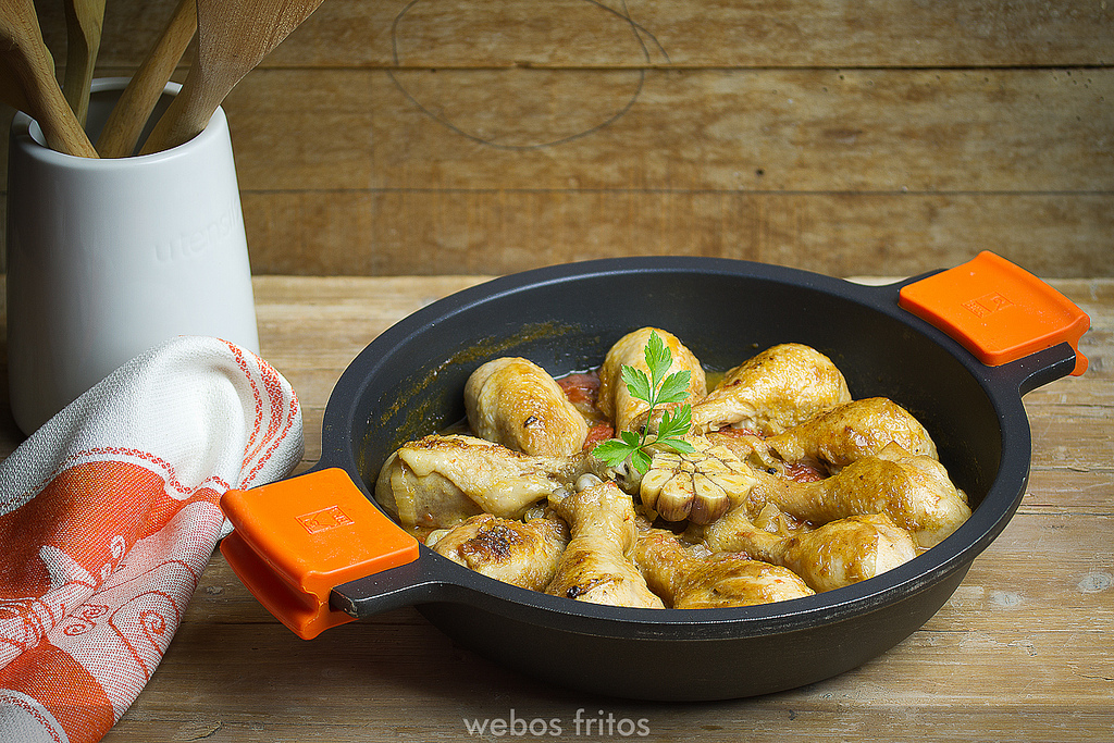 Freímos los muslos en este aceite y vamos echándolos en la cazuela que tenemos preparada al efecto. Suele saltar, con lo que igual tenéis que ponerle una tapa mientras los freís.