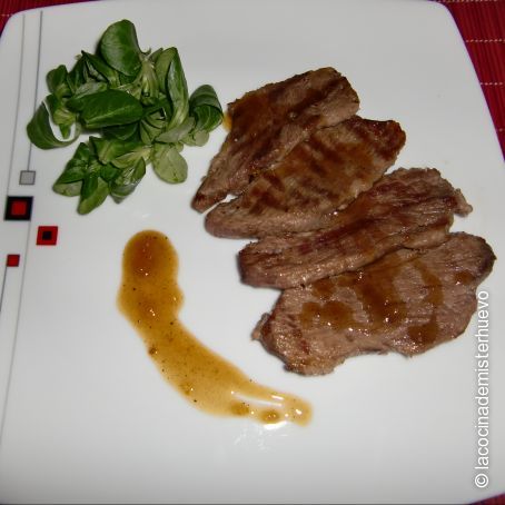 Emplatamos salseando un poquito por encima de los filetes de presa o bola ibérica y poniendo un poquito más de salsa en el plato. Podemos acompañar con una ensalada verde.