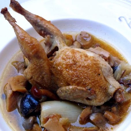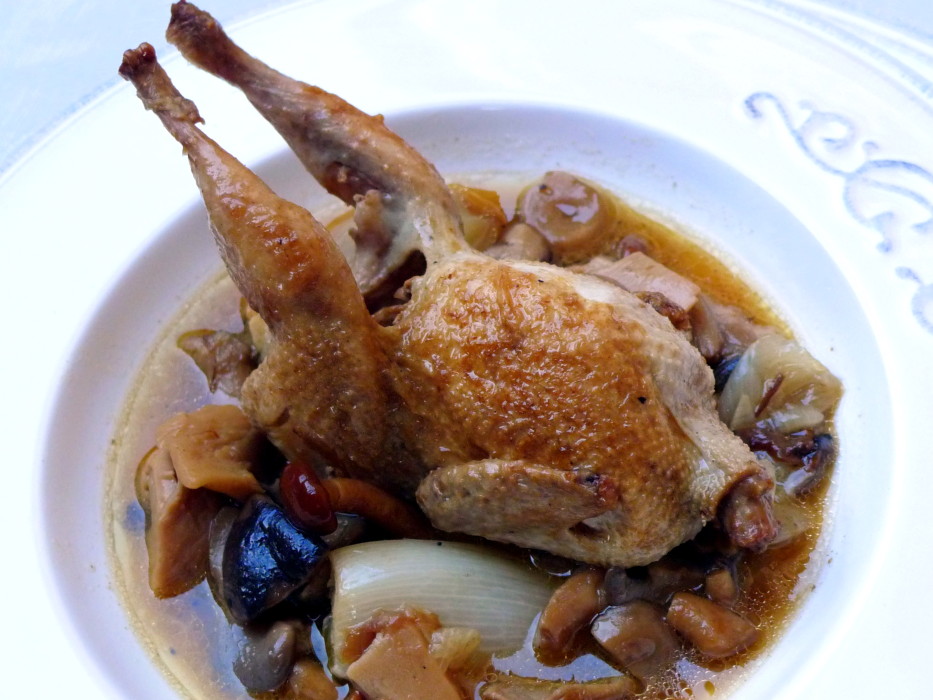 La receta que describes es básicamente una codorniz en escabeche, pero la que muestras en la foto lleva setas, que no veo entre los ingredientes ni en la elaboración.