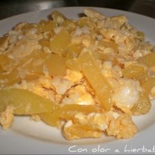 En una cazuela se pone un poco de aceite, la cebolla cortada muy fina y las patatas a trocitos se rehoga.