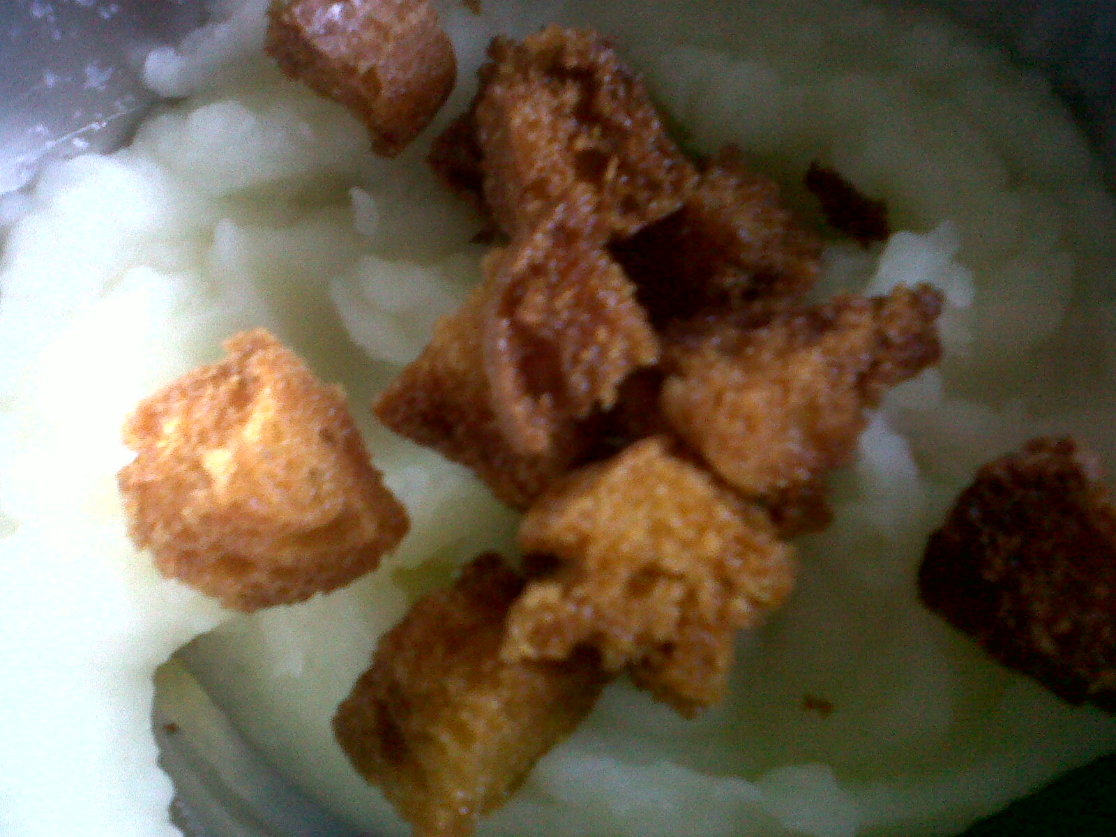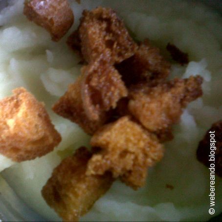Añade los picatostes al puré y dale unas vueltas para que se mezcle todo.