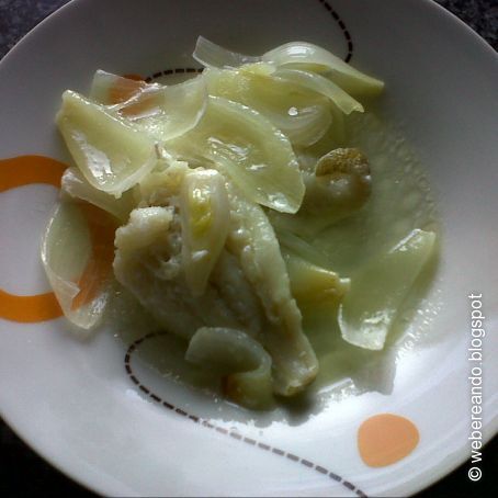 Pon en una cazuela la cebolla cortada en trozos grandes, el pescado (sálalo) y un chorrito de aceite.
