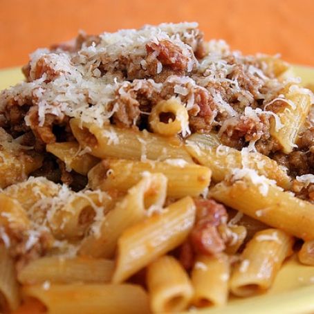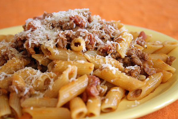 Añadir a la pasta, echar tomate frito y queso rallado por encima.