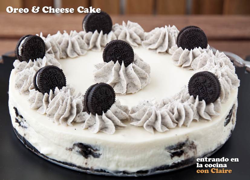 Verter la mitad de la mezcla en el molde, colocar con suavidad las 5 oreo encima de la masa formando una corona en la parte central de la tarta. Verter con suavidad el resto de la mezcla, para que no se muevan las oreo de manera que las galletas quedaran en la parte central de la tarta. Poner a refrigerar como mínimo dos horas.