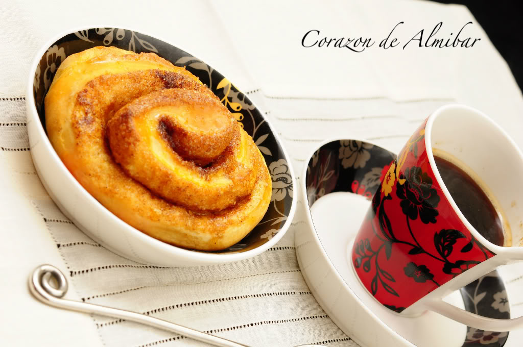 oner harina encima de la mesa de trabajo y sacar la bola del vaso, estirarla con un rodillo dándole forma rectangular, fundir la mantequilla y pintar la parte superior del rectángulo con una brocha de cocina, esparcir el azúcar mezclada con la canela por toda la superficie. Liar el rectángulo sobre sí mismo y hacer rodajas con un cuchillo muy afilado de unos 2 cm., poner en un molde redondo untado con mantequilla las rodajas algo separadas entre si y dejar que fermenten unos 30 minutos en un sitio cálido (se pueden fermentar en el horno calentandolo a 50º y apagándolo) dejar la puerta entreabierta y meter el molde para que fermente.