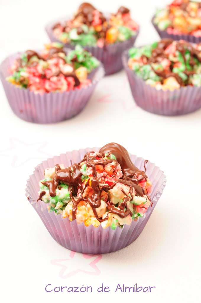 Colocar las palomitas en un cuenco y verter por encima el chocolate caliente en hilo, remover las palomitas para que se peguen entre ellas, coger porciones e ir llenándo las capsulas de magdalena. Dejar enfriar para que se endurezcan las rocas.