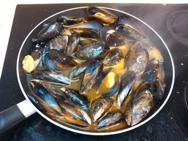 abrir los mejillones con 1 vaso de agua.