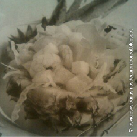 partir piña por la mitad y vaciar. Hervir gambitas, enfriar.