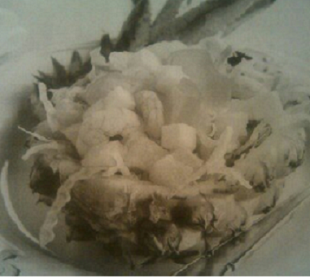 Partir ensalada en trocitos alargados, mezclar todo con mahonesa y ketchup. Rellenar la piña y servir frio.