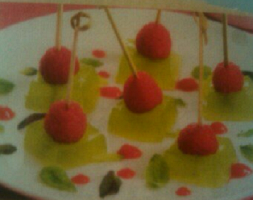 cortar gelatina en dados, poner encima frambuesa y clavar un palillo.