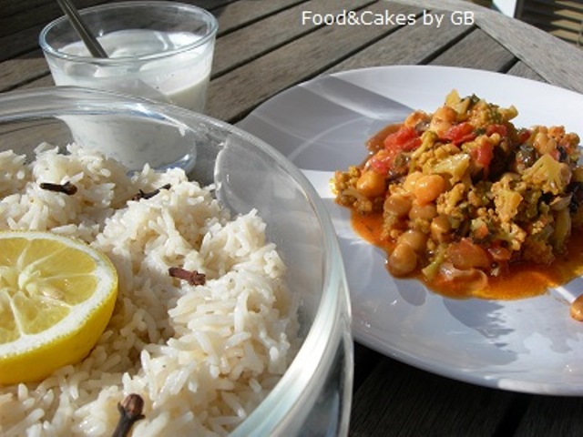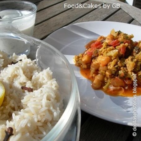 Curry de verduras, arroz basmati al aroma de clavo y salsa de yogur a la menta