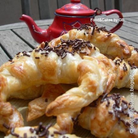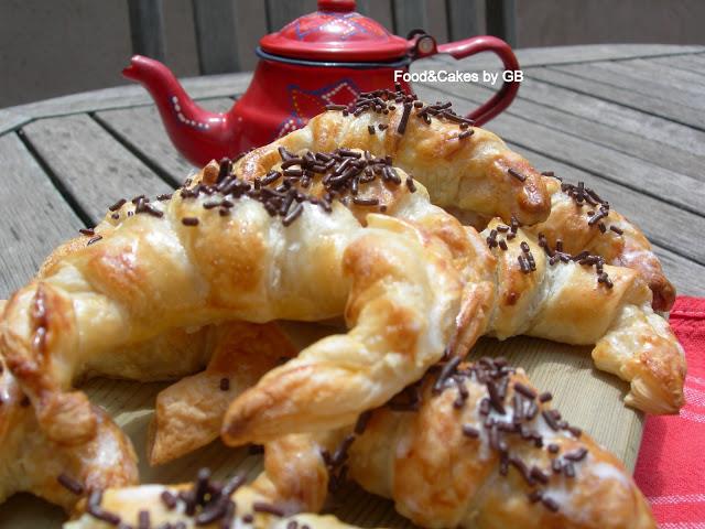 Dejamos temperar y cuando saquemos los croissants del horno, los pincelamos con el almíbar y los adornamos con los fideos de chocolate.