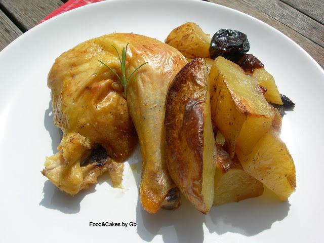Pondremos el limón partido por la mitad dentro del pollo junto con unas cuantas ciruelas, sal, pimienta y el tomillo y con la ayuda de unos palillos lo cerraremos. Pondremos el pollo en la bandeja del horno y lo salpimentaremos, junto con el agua, el brandy y el vino blanco.