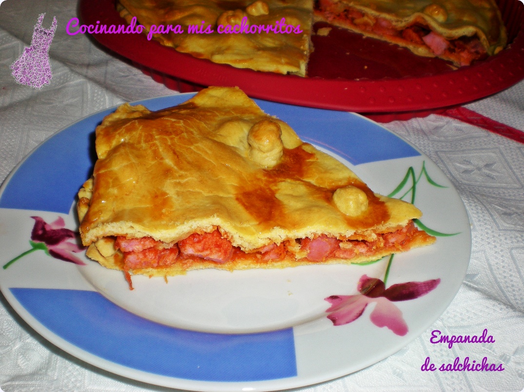 Sacamos la base de la empanada del horno y rellenamos con la mezcla de salchichas y tomate frito.