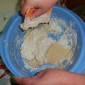 Colocar en un bol 400 g. de harina y agregar la levadura mientras mezclamos con las manos, añadir el huevo, la mantequilla y poco a poco la leche mientras seguimos amasando. Si vemos que la masa se pega en las manos añadir el resto de la harina, yo la necesité toda.