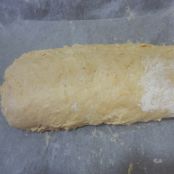 Transcurrido el tiempo de reposo estiramos la masa con un rodillo, yo lo he hecho sobre papel de horno y de ese modo luego nos será más fácil enrollar. Con la masa formamos un rectángulo, si es necesario espolvoreamos con harina para que no se nos pegue al rodillo, cortamos los bordes sobrantes de masa y la reservamos para luego decorar el pan.
