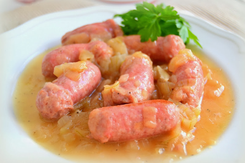Cortamos las salchichas en dos o tres pedazos y los añadimos a la sartén, un pellizco de sal y un pedacito de pastilla de caldo. Cocinamos a fuego medio unos minutos, rebajamos el fuego a lento y añadimos el vino blanco. Cocinamos de 20 a 25 minutos a fuego lento.