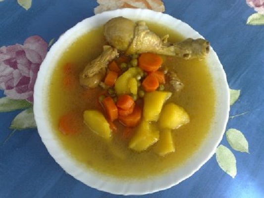 se pone aceite en la olla y cuando está caliente, ponemos la carne troceada y sazonada, los ajos y un hoja de laurel. Cuando está sobrita la carne, añadimos la cebolla, el tomate, el pimiento y la zanahoria, y lo sobreimos un poco. Añadimos un vaso de vino, dejamos que hierva un poco, a continuación añadimos el agua y dejamos que hierva. A los diez minutos, añadimos los guisantes y las alcachofas, lo dejamos otros diez minutos y añadimos las patatas, el azafrán y la sal. Cuando está la patata guisada, apartamos y listo para comer.