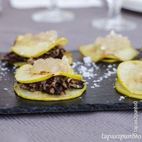 Para montar el plato ponemos una rodaja de manzana, la morcilla y otra rodaja de manzana, acabaremos cubriendo el agujero que le hacemos a la manzana para quitar las pepitas con una cucharada de cebolla confitada.