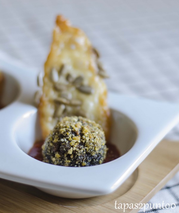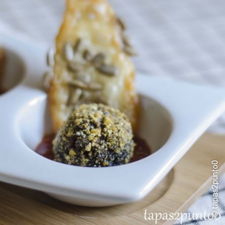 Esferas de morcilla con airbag de kikos, confitura de pimientos y crujiente manchego con pipas