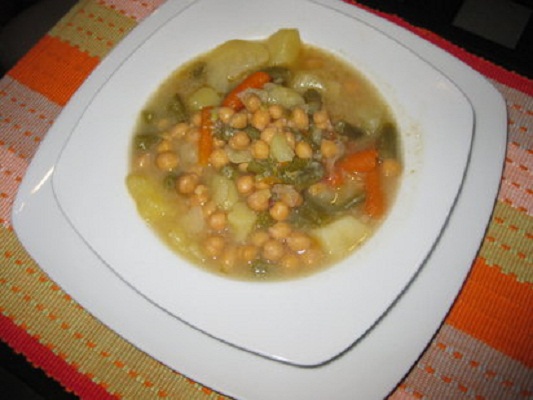 Servimos en el plato el caldito junto con las verduras y los garbanzos.