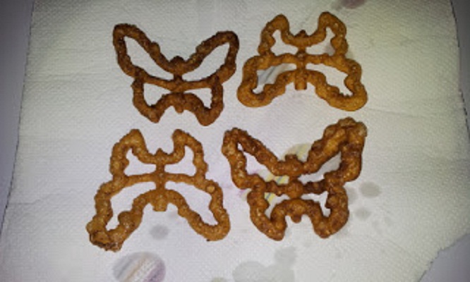 Calentar la roseta en el aceite para que no se pegue nuestra mezcla, sacamos la roseta de la sartén y secamos inmediatamente el exceso de aceite con un papel secante.