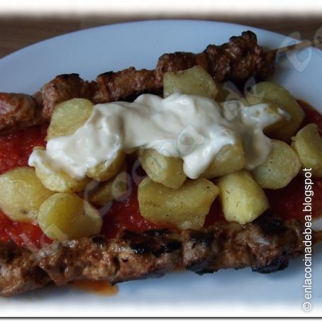 Servimos poniendo como base la salsa de tomate, encima las patatas y, sobre estas, un poco de mayonesa.