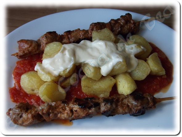 Acompañamos con salchichas o, en mi caso, unos pinchos morunos.