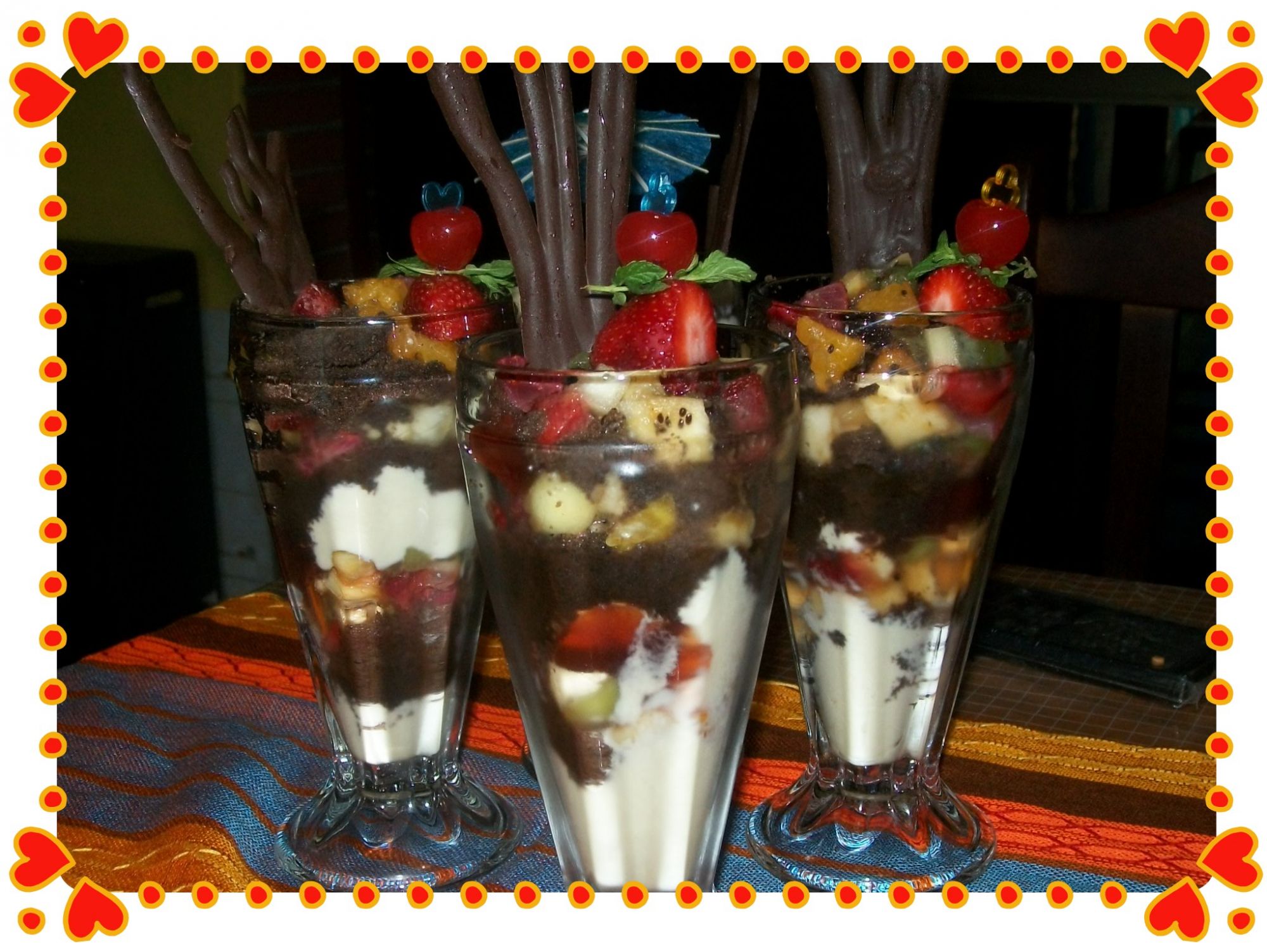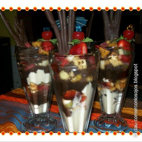 Colocar una base de crema en una copa, luego el brownie desmenuzado y las frutas elegidas y cubrir con la mermelada y seguir de esta manera terminando con la fruta.