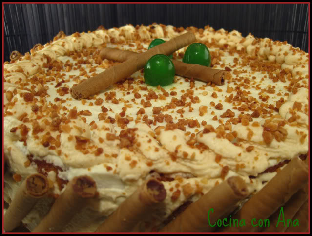 Finalmente adornamos con barquillos todo el contorno de la tarta pegándolos sobre la nata que ya hemos aplicado y espolvoreamos con granillo de almendra caramelizado, para darle el toque final le he puesto unas guindas y unos barquilllos