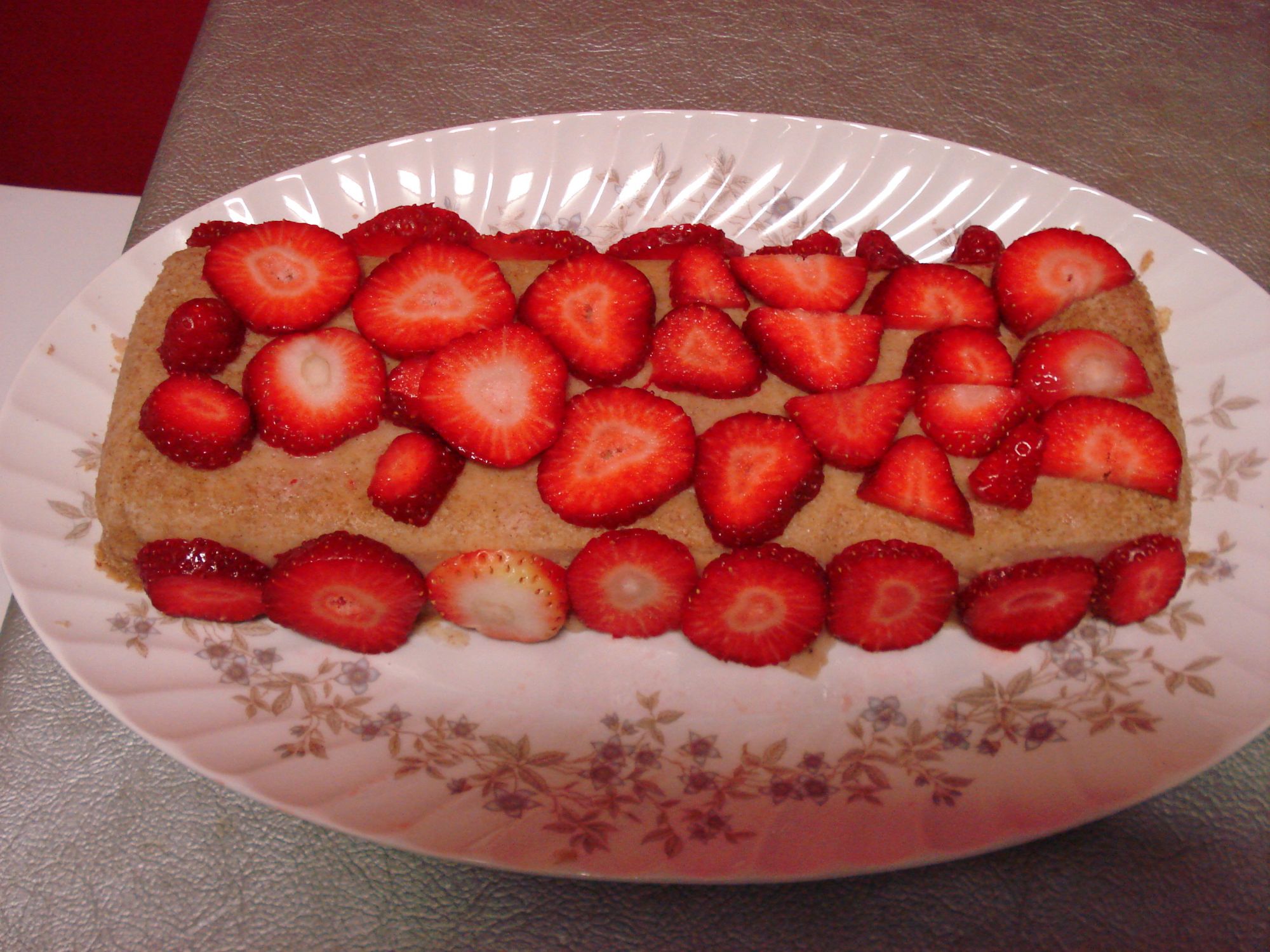 6. Cortamos las fresas reservadas por la mitad y adornamos la tarta al desmoldarla.