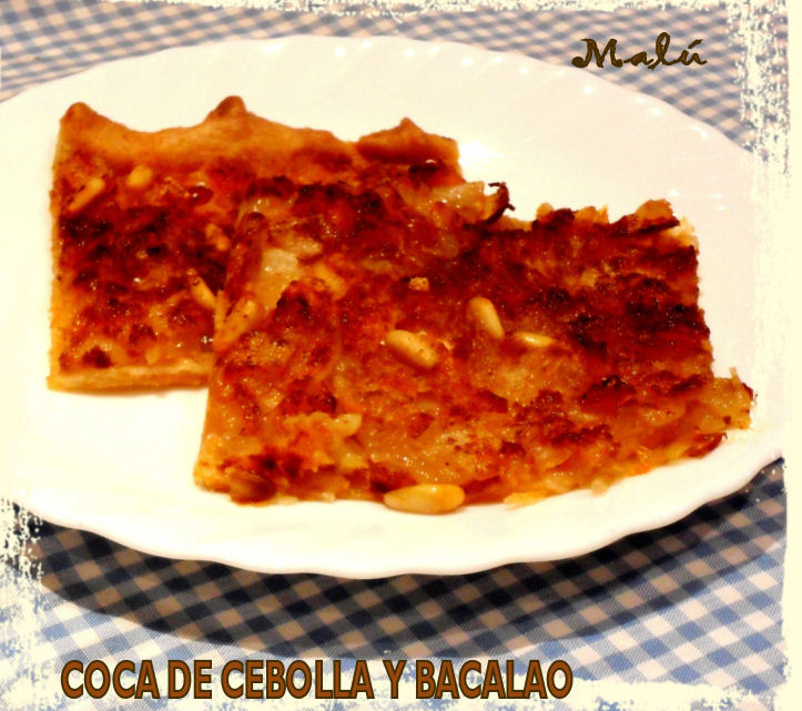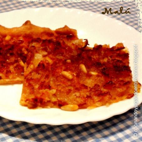 Ahora rellenala con la cebolla, repartiendola por igual en toda la superficie. Reparte por encima el bacalao bien escurrido y los piñones. Espolvorea con pimentón dulce, un poco de harina y pimentón dulce de nuevo. Riega con hilo de aceite de oliva.