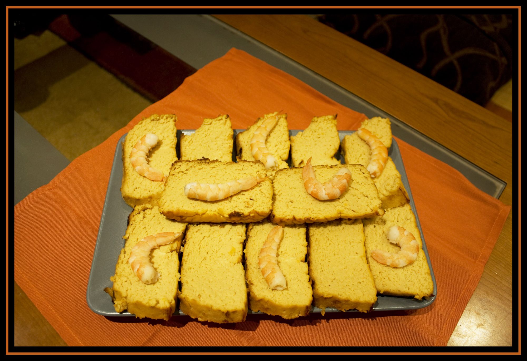 Se desmolda y se parte en rebanadas. Lo bueno de este entrante es que se puede servir frío o caliente, al gusto del comensal. Ponemos las rebanadas en una bandeja y con los ocho langostinos decoramos al gusto.