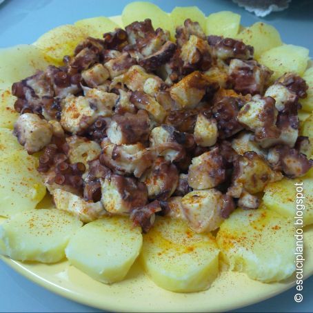"También llamado pulpo a feira, hoy día forma parte de la bandera gallega, de ahí que respete su nombre, que por otro lado le corresponde por su carácter festivo y porque fue en las ferias donde se inició. En ellas, se cocían los pulpos en grandes ollas de cobre. ¿Por qué de cobre? Para poder "asustarlo" tres veces sin que el agua se enfríe. Cuando el agua hierva, se sumerge el pulpo durante un minuto y se saca durante otro para que se enfríe. Se repite la operación tres o cuatro veces, y luego ya se deja hervir. No se sabe el motivo científico, pero solo así queda perfecto. Hay quién dice que es para que la piel se agarre a la carne y las ventosas no se despeguen, otros para que se rompan los nervios y por ello se encogen los tentáculos... . También hay quien aconseja dejarlo enfriar dentro de la olla, en su propio agua, hasta que se vaya al fondo.