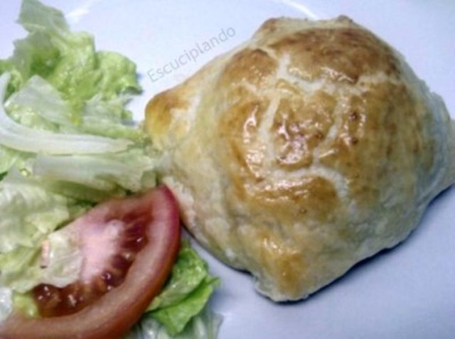 Cerramos el hojaldre como si fuera un sobre, es decir, cogemos las puntas y vamos cerrando, colocando el cierre hacia abajo en la bandeja del horno.