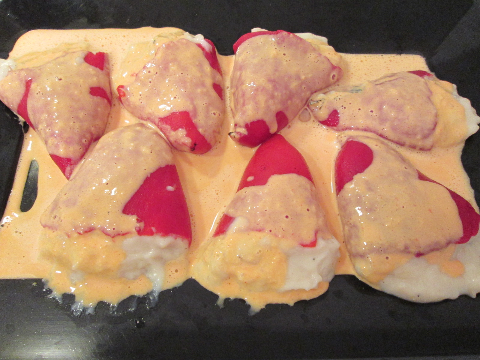 Poner en un bol las gambas peladas el gallo troceado y sin espinas la clara de huevo , la nata y una pizca de sal , triturar bien hasta obtener una crema espesa con la que se rellenaran 12 pimientos reservar el reservar .