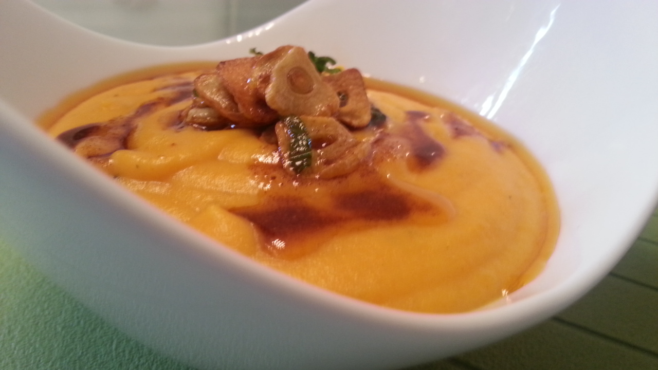 Como hemos puesto en el título, la crema de zanahoria la vamos a presentar con guarnición de ajo frito y para ello, vamos a poner en una sartén un chorreoncito de aceite, añadiendo los ajos fileteados cuando esté caliente. Le echamos dos hojas de albahaca fresca picada y por último media cucharilla de pimentón picante.
